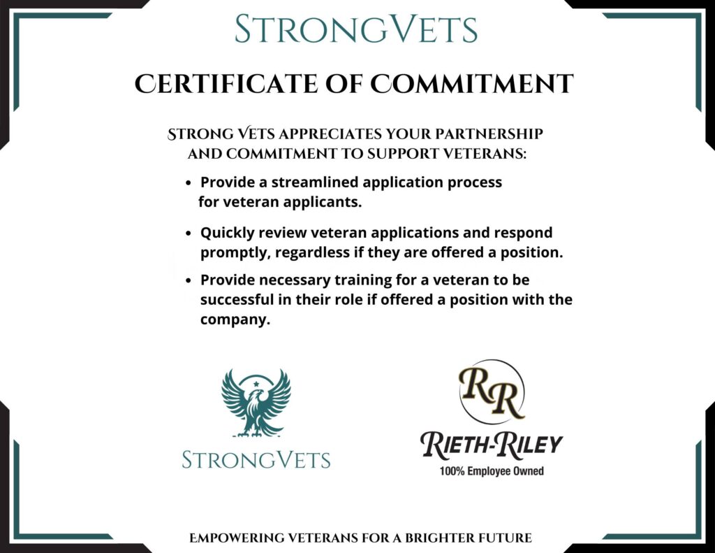 Companies that partner with Strong Vets, like Rieth-Riley, make a commitment to three hiring principles as part of their support for military hiring: